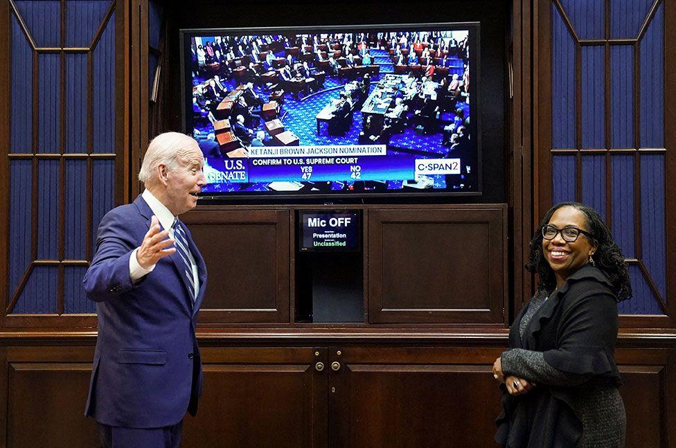 Africa-Press – Seychelles. US President Joe Biden and Judge Ketanji Brown Jackson watch as the Senate votes to confirm her to the US Supreme Court, from the Roosevelt Room at the White House in Washington. The historic vote made her the first black female justice to serve in the nation’s highest court.