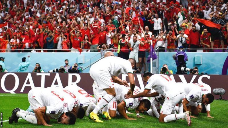 Morocco celebrate their stunning win, their first at the World Cup since 1986, over Belgium