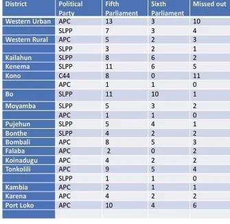 Notably, the fifth Parliament included three Independent MPs, two from Kailahun and one from Pujehun district. All three MPs returned to their original political party, the SLPP, and successfully maintained their seats in Parliament, now as SLPP MPs rather than Independent MPs.