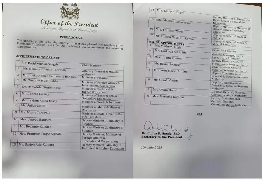Africa-Press – Sierra-Leone. The general public is hereby informed that it has pleased His Excellency the President, Brigadier (Rtd.) Dr. Julius Maada Bio to announce the following appointments.