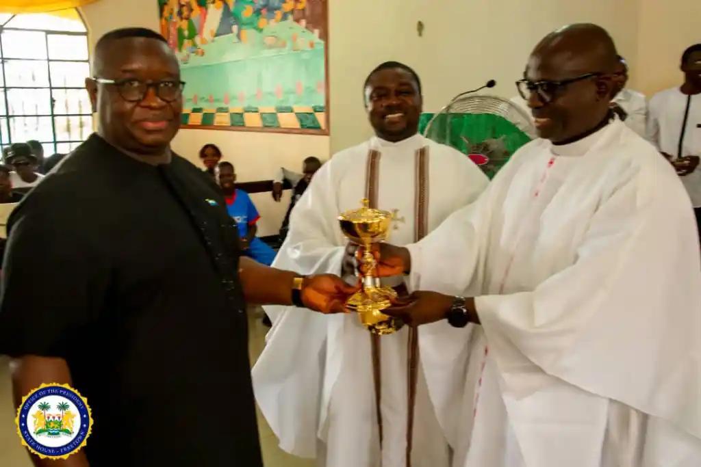 The clergymen at St. Joseph Catholic Church also thanked President Bio for his continued support and devotion to the Catholic Church and the priests upon receipt of sacramentals, including ciborium, chalice, pattern, and thurible, as gifts to the church.