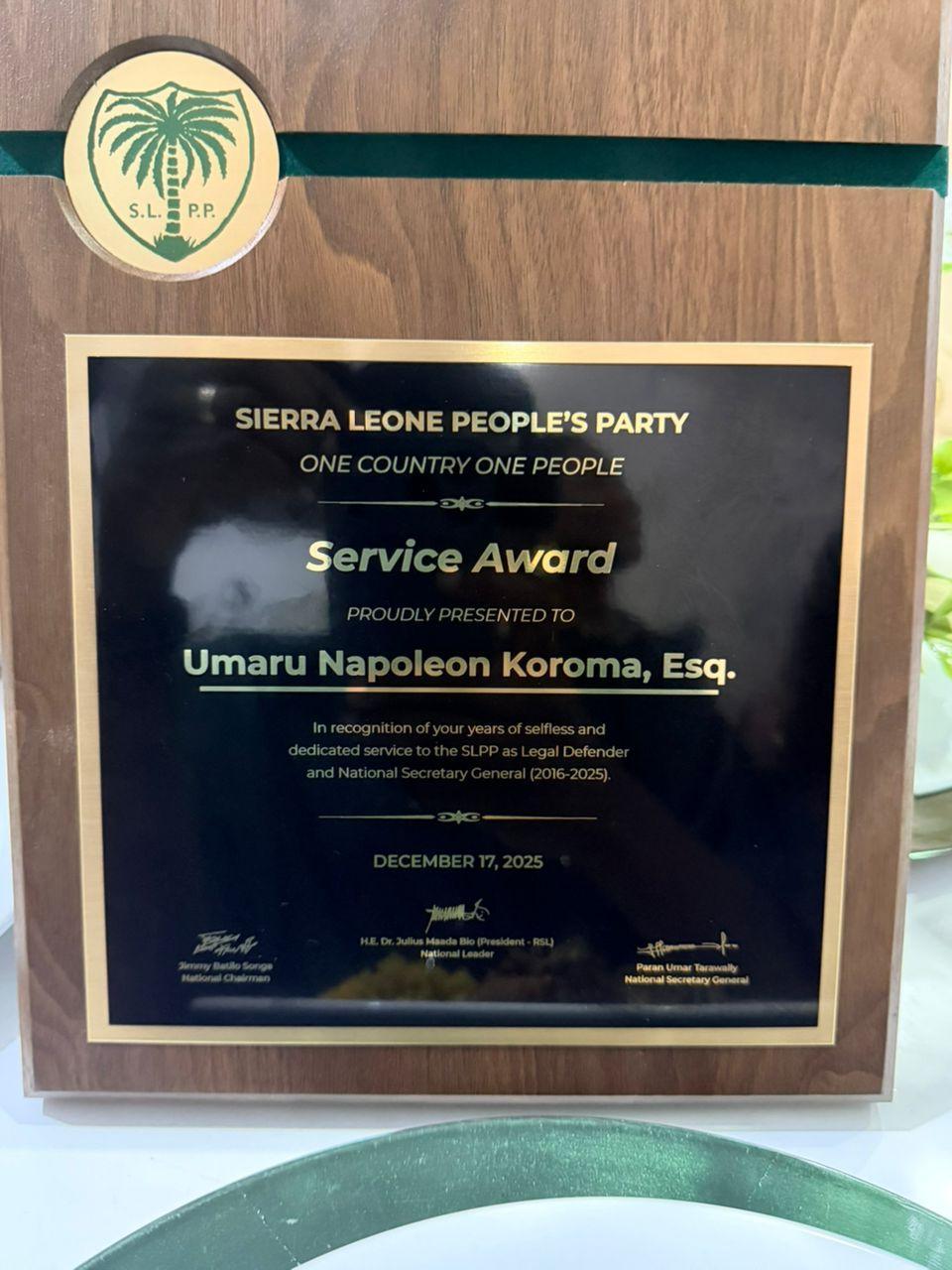 Africa-Press – Sierra-Leone. The Sierra Leone People’s Party (SLPP) has conferred a prestigious award on its former Secretary General, Umaru Napoleon Koroma, in recognition of his enduring commitment, institutional stewardship, and transformative contributions to the party’s organizational development.