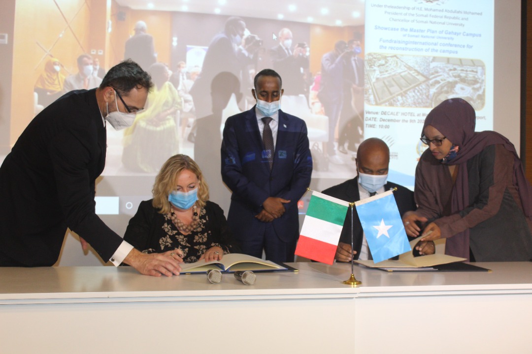 وشارك الوفد الإيطالي الزائر في البلاد في حفل إطلاق مشروع جمع التبرعات لإعادة بناء حرم “غهير”التابع للجامعة الوطنية الصومالية.