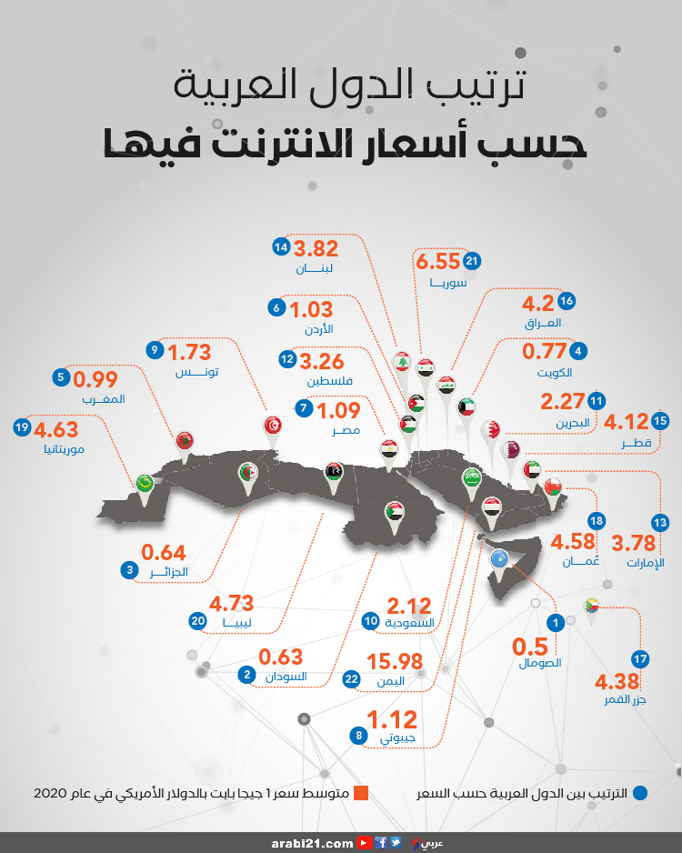 وبحسب الموقع، تباينت أسعار الجيجابايت الواحد، ليكون سعرها في الصومال هو الأرخص في قائمة الدول العربية، وبلغ متوسط سعر الجيجابايت الواحد فيها 0.5 دولار، في حين كانت اليمن الأغلى عربيا بواقع 15.98 دولارا.