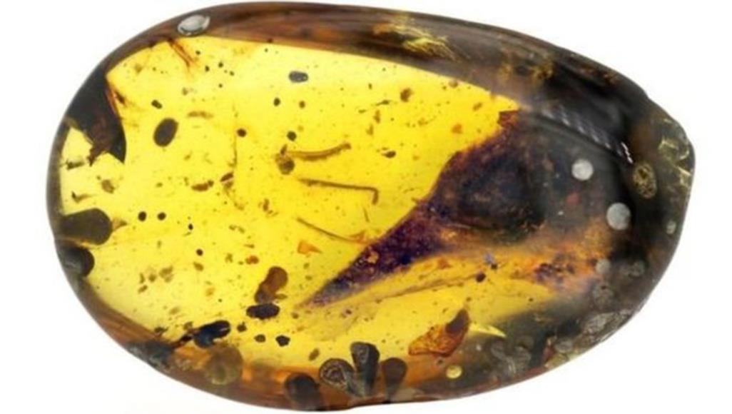 عثر علماء آثار في ميانمار على بقايا ديناصور عمره حوالي 99 مليون سنة -يعتقد أنه أصغر أنواع الديناصورات المجنحة في العالم- في قطعة من حجر الكهرمان.
