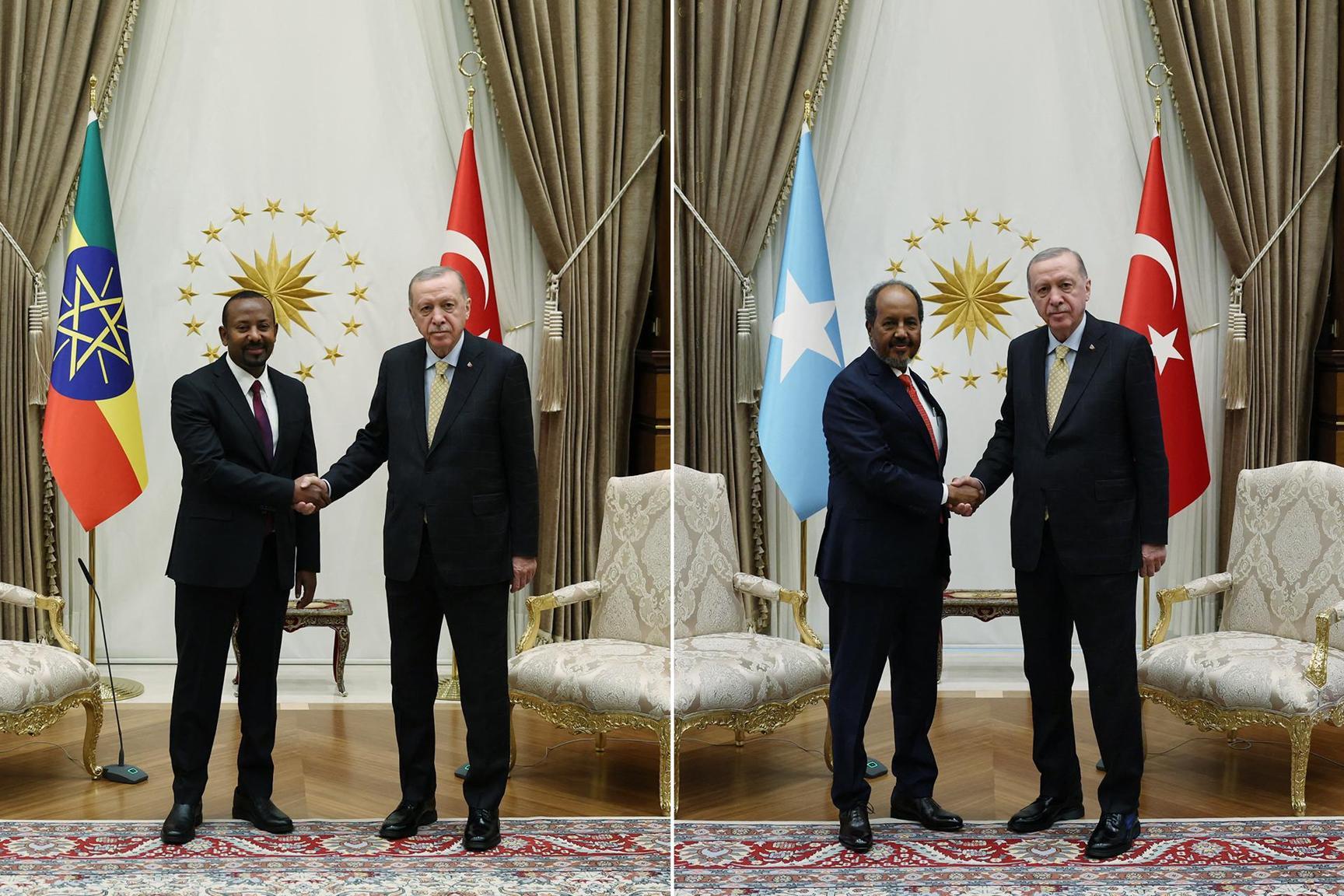 أفريقيا برس – الصومال. عقد الرئيس التركي رجب طيب أردوغان، اليوم الأربعاء، محادثات في أنقرة مع رئيس الوزراء الإثيوبي آبي أحمد والرئيس الصومالي حسن شيخ محمود، ضمن المساعي التي تبذلها تركيا منذ أشهر، لحل نزاع أجّجته اتفاقية أبرمتها إثيوبيا مع إقليم أرض الصومال الانفصالي.