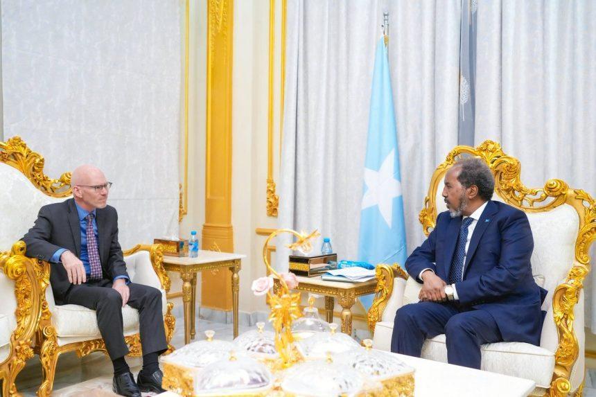 أفريقيا برس – الصومال. استقبل رئيس جمهورية الصومال الفيدرالية، حسن شيخ محمود، يوم الاثنين، القائم بأعمال الممثل الخاص للأمين العام للأمم المتحدة جيمس سوان في القصر الرئاسي.