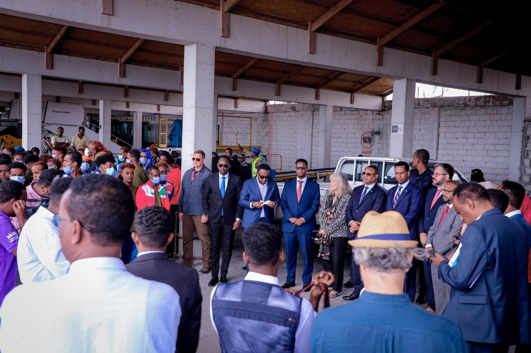 وكان في مقدمة مستقبلي العائدين إلى العاصمة النائب الثاني لرئيس الوزراء، السيد جبريل عبد الرشيد حاجي عبدي، ونائب وزير الخارجية والتعاون الدولي، والنائب إسحاق محمود مرسل، إلى جانب مسؤولين حكوميين وممثلين عن الاتحاد الأوروبي والمنظمة الدولية للهجرة.