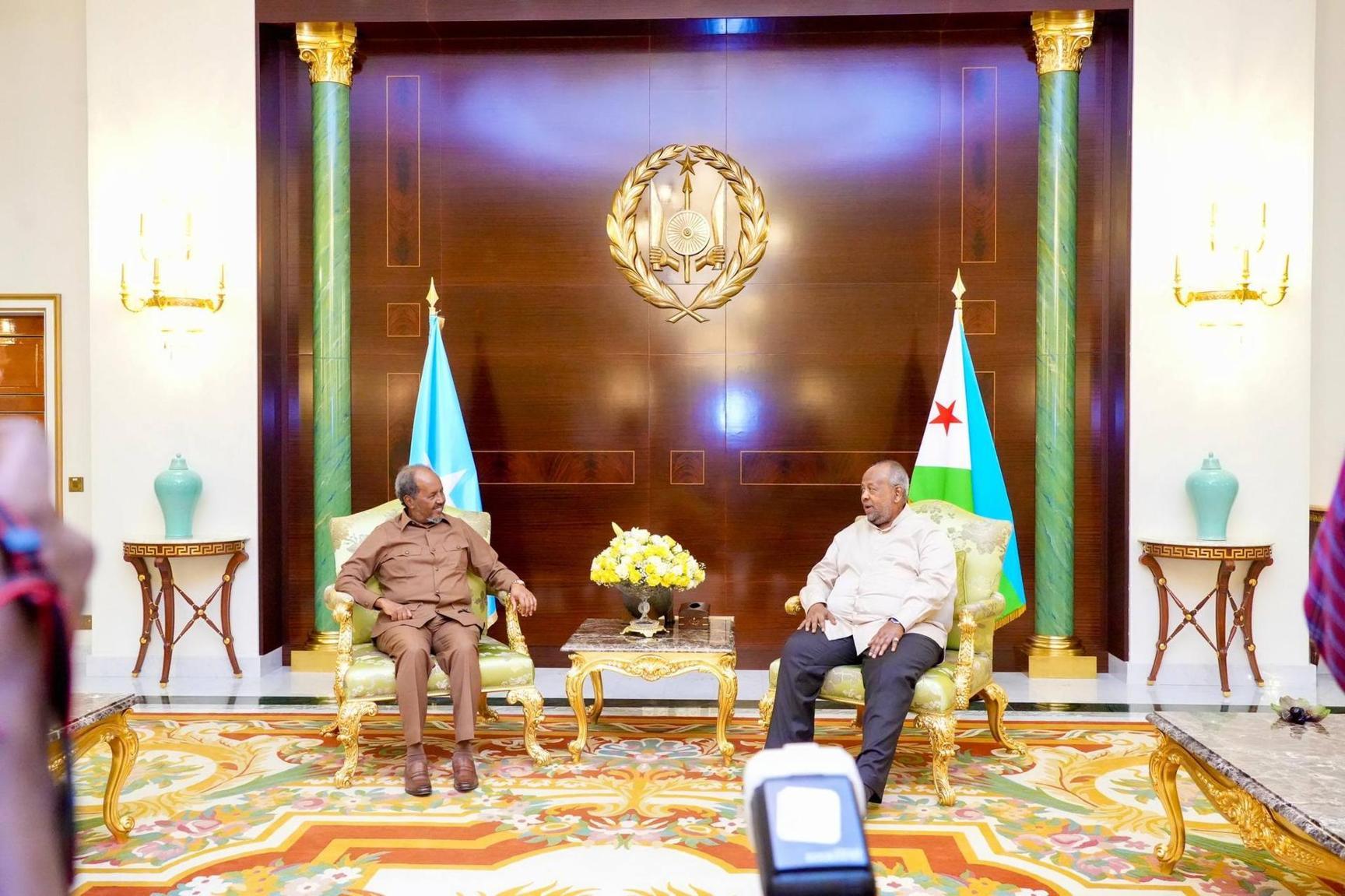 أفريقيا برس – الصومال. التقى الرئيس الصومالي حسن شيخ محمود بالرئيس الجيبوتي إسماعيل عمر جيلي، يوم الأربعاء، لمناقشة تعزيز العلاقة العميقة بين بلديهما وتعزيز التعاون في مختلف المجالات، بما في ذلك الأمن والاقتصاد.