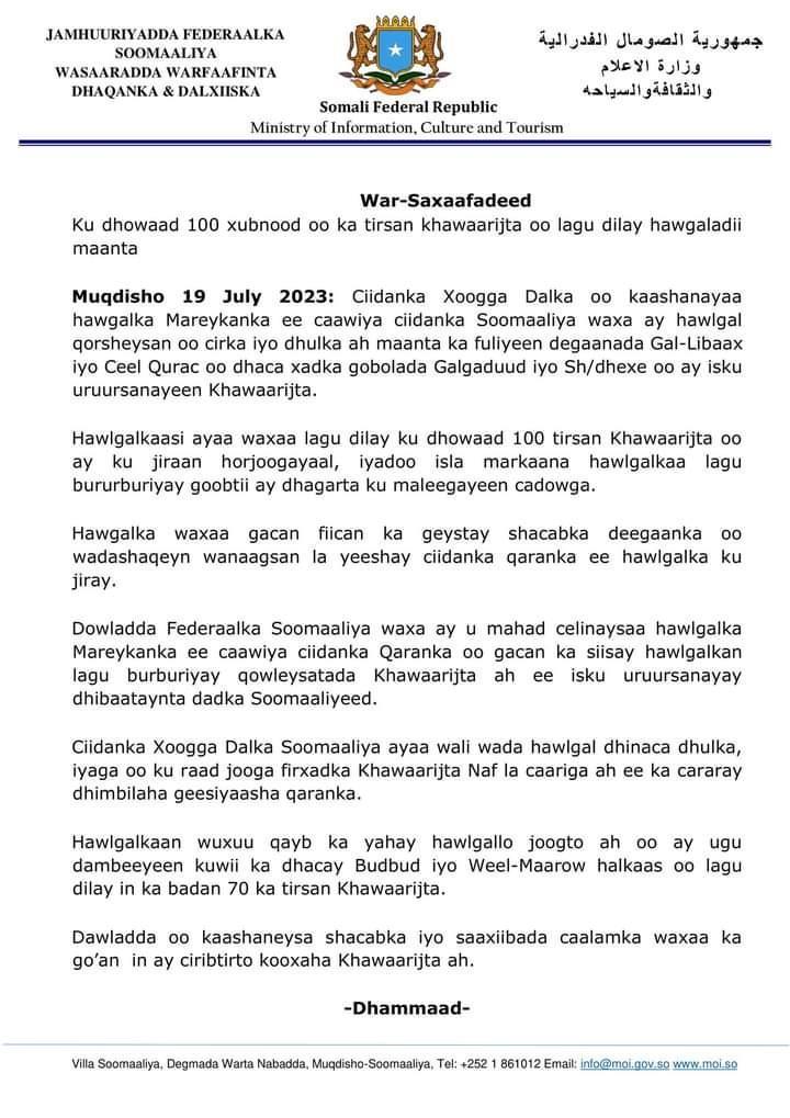 أفريقيا برس – الصومال. أعلنت وزارة الإعلام الصومالية اليوم الأربعاء أن القوات الحكومية بالتعاون مع جيش الولايات المتحدة الأمريكية نفذت عمليات جوية وبرية اليوم في منطقتي غال ليباكس وسيل كوراك وسط الصومال، مما أسفر عن مقتل ما يقرب من 100 من مقاتلي حركة الشباب.