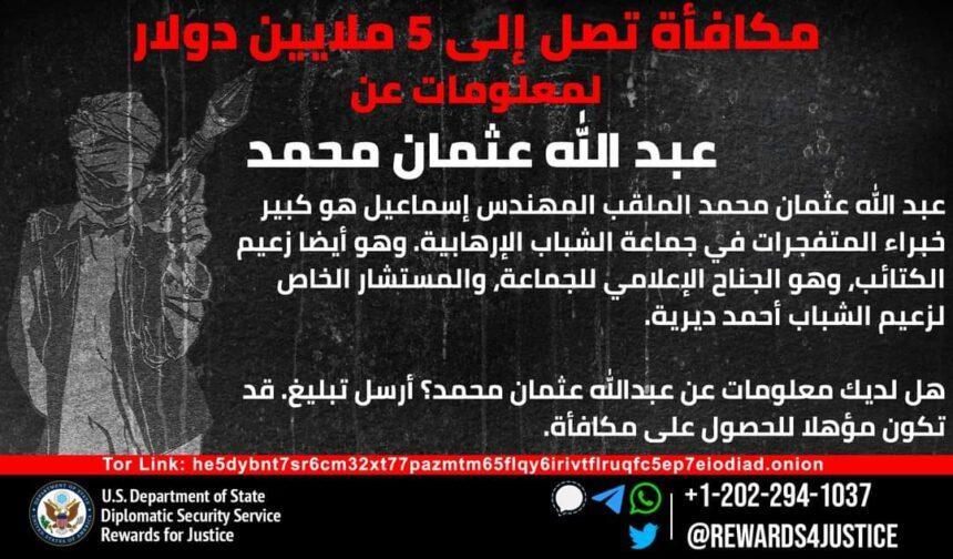 أفريقيا برس – الصومال. أضاف برنامج المكافآت من أجل العدالة التابع لوزارة الخارجية الأمريكية عبد الله عثمان محمد، المعروف بالمهندس إسماعيل، إلى قائمة المطلوبين، وهو خبير المتفجرات في مليشيات الشباب الإرهابية ويعمل أيضا الجناح الإعلامي ومستشارًا خاصًا لزعيم الشباب أحمد ديريه.