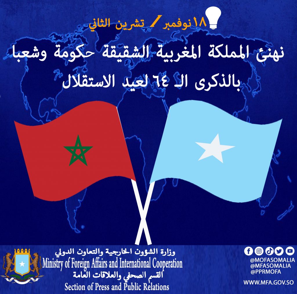 الصومال – افريقيا برس. بعثت وزارة الخارجية والتعاون الدولي برقية تهنئة إلى الملك محمد السادس ملك المملكة المغربية وذلك بمناسبة ذكرى استقلال بلاده.