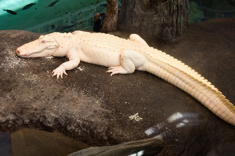 يوجد نوع من التماسيح يُطلق عليها “ألبينو” ولونه أبيض. لا يعيش كثيرا لأنه لا يستطيع التخفي جيدا بسبب لونه، مما يجعله عرضة للخطر بشكل دائم.