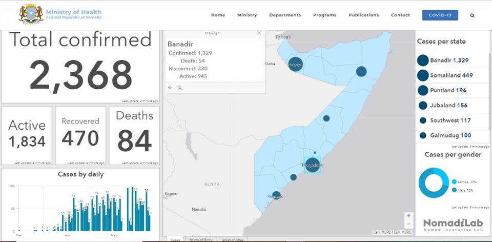وأكدت معالي فوزية أبيكر نور تسجيل 34 اصابة جديدة بفيروس كورونا ليصل اجمالي الحالات المسجلة في البلاد إلى 2,368 حالة،حيث توزعت الحالات الجديدة على أرض الصومال بـ19 حالة ،وولاية جلمدج بـ15 حالة.