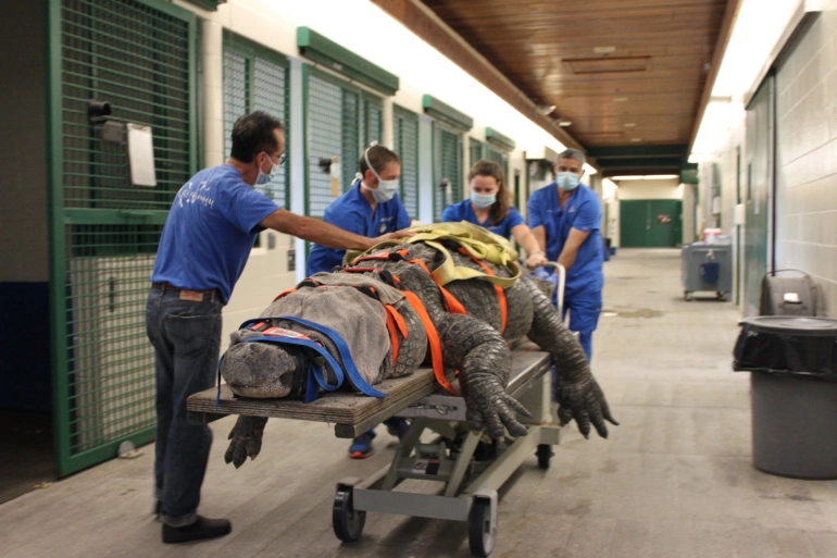 وبحسب منشور عبر صفحة الكلية على فيسبوك، فإن التمساح الذي يزن نحو 300 كيلوغراما، جاء من إحدى حدائق الحيوان في فلوريدا، من أجل إجراء أشعة مقطعية على ساقه اليمنى الخلفية؛ لمعرفة سبب العرج الذي يعاني منه.