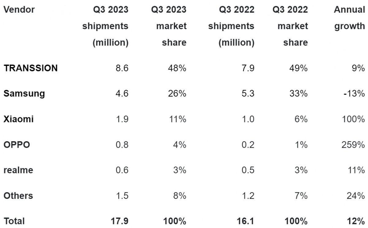 Transsion, the company behind Tecno, Infinix, and iTel brands, remained an undisputed leader with a 48% market share, almost twice as much as the second-placed Samsung.The region demonstrated strong resilience in demand and supply, in contrast with the macroeconomic challenges makers are facing elsewhere. South Africa, for example, saw a growth of 20% despite rapid currency devaluation.