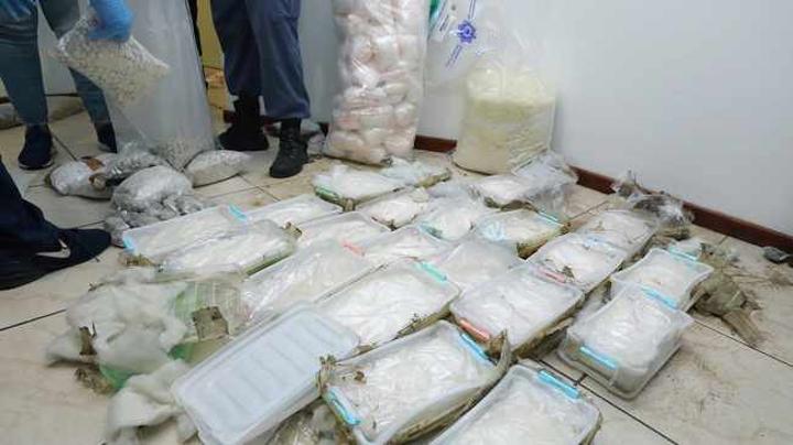 Officers pounced on the premises on Burcell Street and discovered an assortment of large quantities of drugs as well as unlicensed firearms and ammunition, including 52 kg of methamphetamine estimated at R18.2 million, 8 850 mandrax tablets valued at R442 500, 0.5kg of hydroponic cannabis worth R40 000, three pistols and a revolver, 286 rounds of ammunition and 13 magazines and a holster.