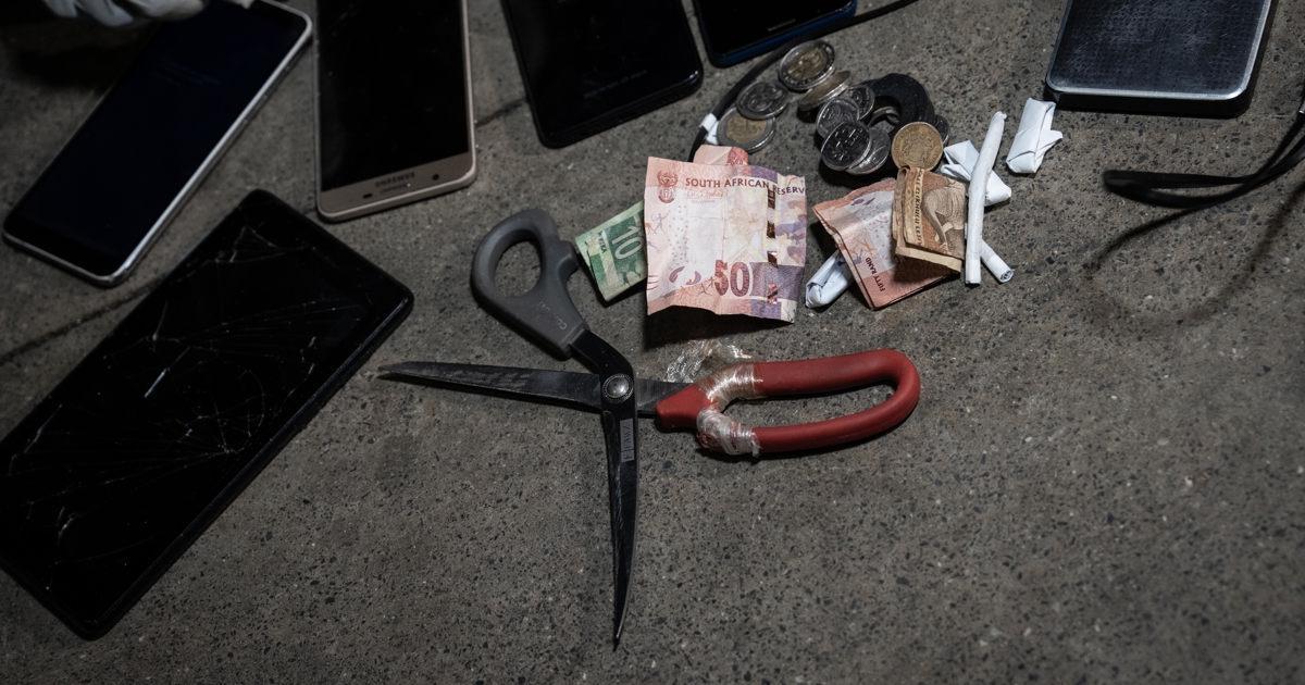 Among the items seized were cellphones, mandrax tablets, tik sachets, dagga, and sharp objects.