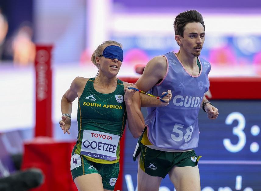 Coetzee sliced five seconds off her time winning silver in Tokyo and hit the line with her guide Estian Badenhorst in 4:35.49, a personal best in the fastest race ever run for T11 athletes.