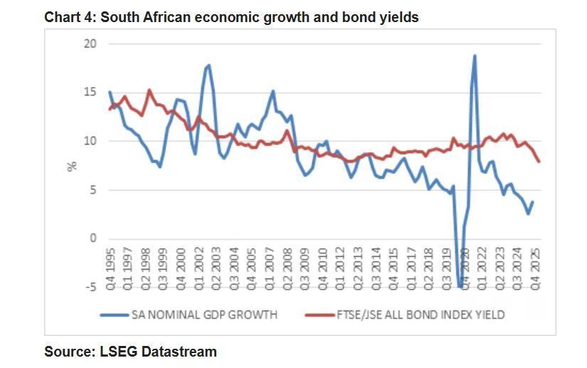 “Bond yields should move in line with nominal GDP growth. This was the case in South Africa too, until around 2013, when the economic performance deteriorated sharply, and with it, the government’s creditworthiness,” Odendaal said.