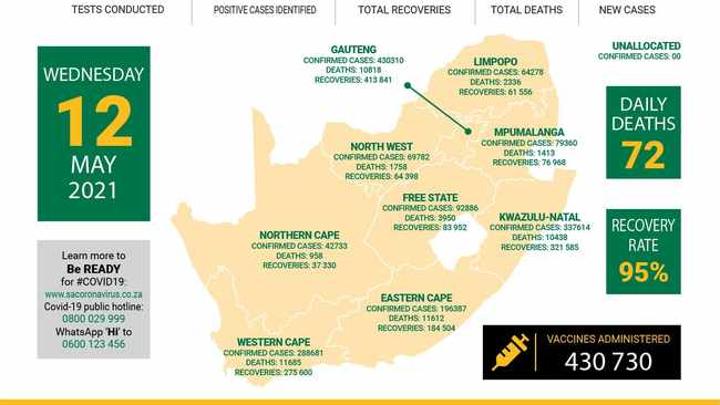 Data from the last reporting week (May 3 to May 9,, 2021) showed an overall 46% new case increase in comparison to the previous reporting week (April 26 to May 2, 2021), with the Northern Cape (68%), Gauteng (63%) and Limpopo (47%) provinces topping the list.