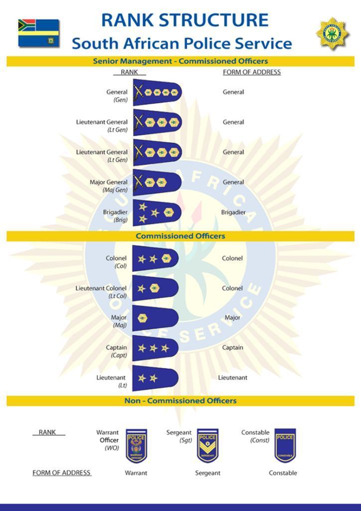 These two ranks in the SAPS are the two layers of senior management before getting to Lieutenant Generals and the General, who serve as deputy and national commissioners.