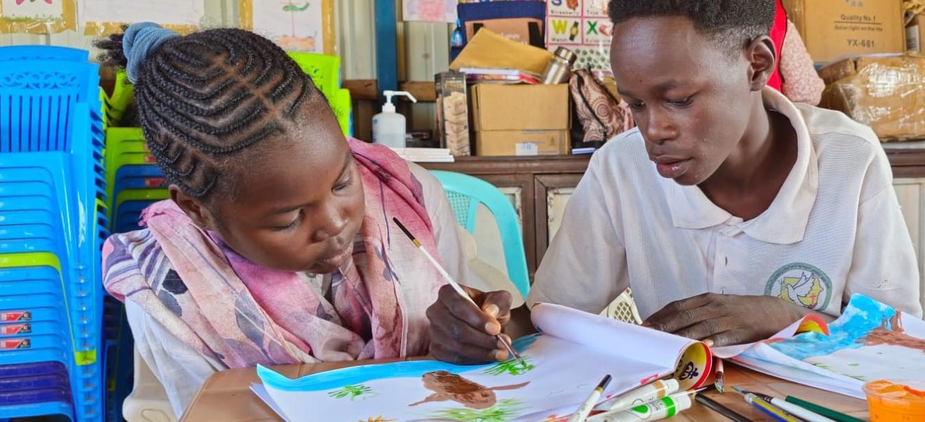 Fourteen-year-old Ghail Mohamed Abdullah fled Sudan with her mother after their neighbourhood became unsafe. Inside the centre, she carefully colours pictures of rivers, birds and homes – scenes from a life interrupted.