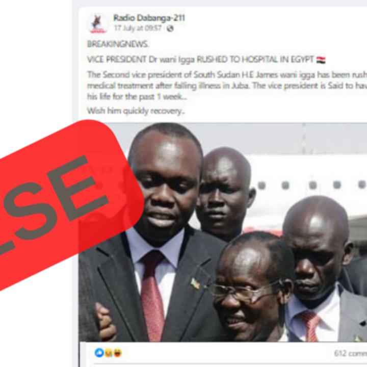 Africa-Press – South-Sudan. A post was circulated on Facebook with claims that South Sudan’s Vice President, Dr. James Wani Igga was rushed to Egypt for treatment after weeks of ailment. This post is FALSE. The Vice President travelled to India to participate in the 17th CII-Exim Bank conclave on the India-Africa project partnership.