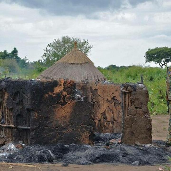 Majiok, his right hand shacked to his right leg by handcuffs and his left arm firmly tied to his left leg by two soldiers who are taunting him in the Nuer language while he casually smiles, laughs, and answers them back, perhaps knowing that his fate is sealed-is then sat in the middle of a decrepit and abandoned hut and set ablaze. His immolation was supposedly to avenge that of Commissioner Manime who burned to death in his house after his home was attacked in July. It was clearly revenge!