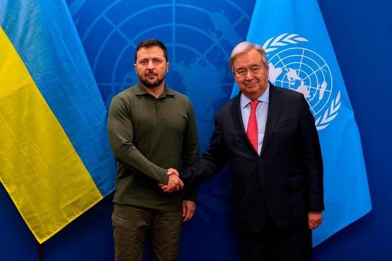 Africa-Press – South-Sudan. President of Ukraine Volodymyr Zelensky (L) shakes hands with United Nations Secretary-General Antonio Guterres at the 78th session of the United Nations General Assembly at UN headquarters in New York City, US on September 19, 2023.