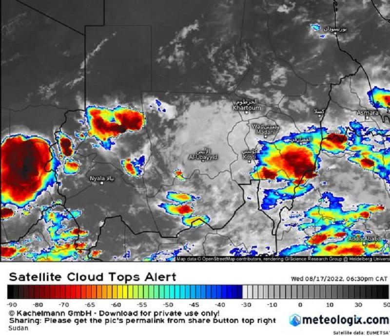 أفريقيا برس – السودان. رصدت صور الاقمار الصناعية مساء اليوم سحبا رعدية ممطرة علي ولايات البحر الاحمر، القضارف، سنار، النيل الازرق، جنوب كردفان ومعظم ولايات دارفور . ومن المتوقع ان تتسبب في هطول امطار متوسطة الي غزيرة في تلك المناطق.