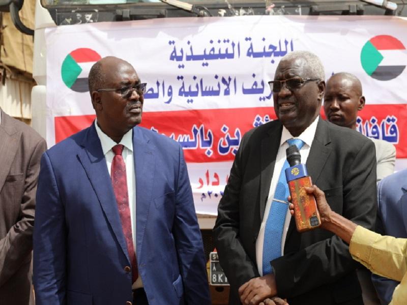 أفريقيا برس – السودان. دشن وزير التنمية الاجتماعية ورئيس اللجنة التنفيذية للطوارئ الإنسانية والصحية الأستاذ أحمد آدم بخيت ووالي غرب دارفور اللواء خميس عبدالله ابكر قافلة المساعد ات الانسانية المتجهة الى ولاية غرب دارفور امس بمنطقة كرري.