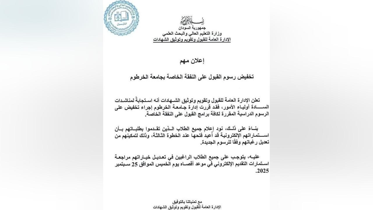 وأكدت وزارة التعليم العالي والبحث العلمي السودانية، أن القرار يأتي استجابةً للنداءات المتكررة من الطلاب وأسرهم، بعد أن أصبحت الرسوم الدراسية تمثل عبئًا كبيرًا على كثير من الأسر السودانية.