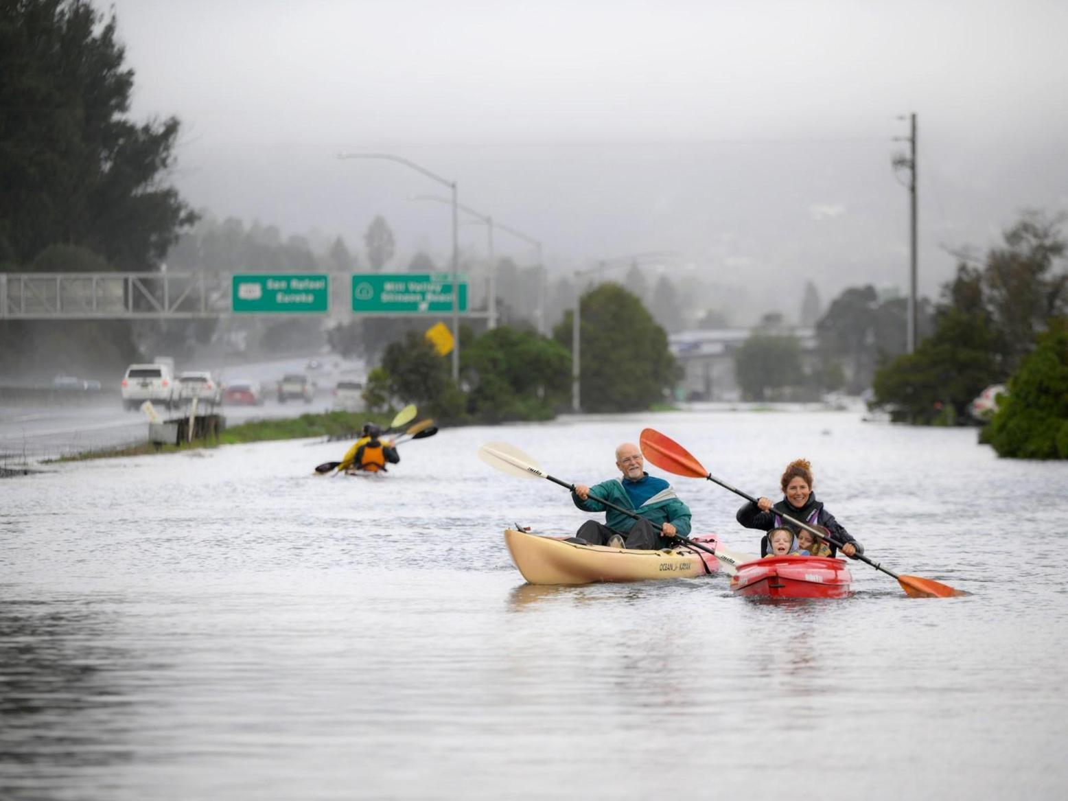 ودعت السلطات في المناطق المتضررة، الواقعة شمال سان فرانسيسكو، السكان إلى البقاء في منازلهم حتى انحسار المياه ونزول مستواها. وجدّف بعض الناس بقوارب الكاياك على طول الشوارع المغمورة بالمياه من أجل التنقل وسط تلك الأوضاع.