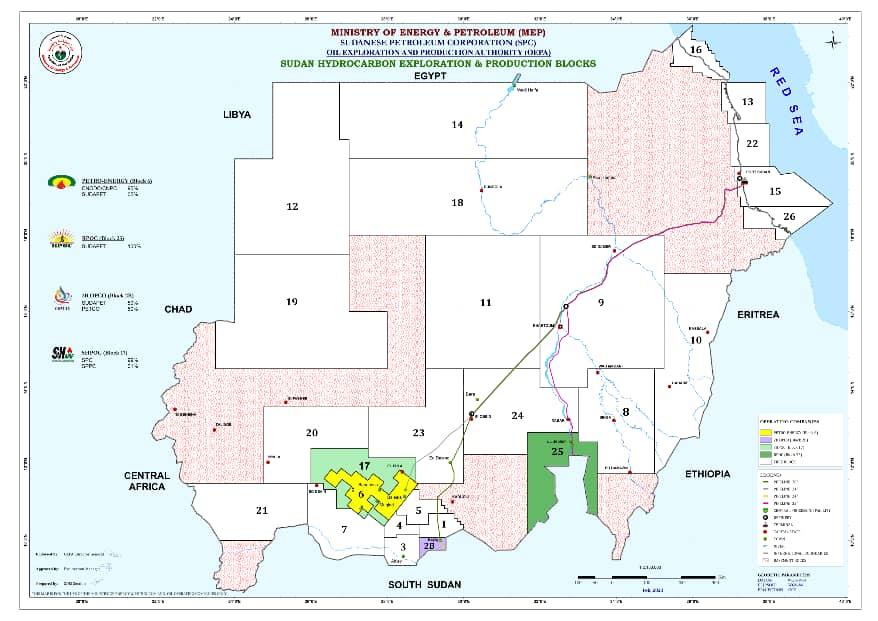 وأوضحت الوزارة أن صبحت جملة المربعات النفطية بالسودان أصبحت (26) مربعاً منها (5) مربعات بحرية تغطي المياه الاقليمية والمناطق الساحلية للسودان في البحر الأحمر ، و (21) مربعا بري تشمل ولايات السودان المختلفة .