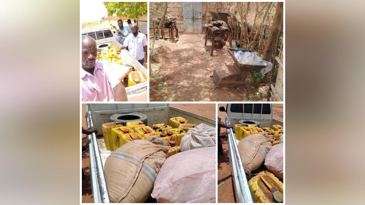 وأسفرت المداهمة عن ضبط المتهم (م. ع. أ) داخل منزل يستخدم كمصنع عشوائي، أثناء قيامه بعصر حبيبات التبلدي وخلطها مع قشر الفول السوداني ومخلفات “الأنباز”، حيث تم العثور بحوزته على عدد (14) جركانة سعة (16) لترًا من الزيت المعد للبيع.