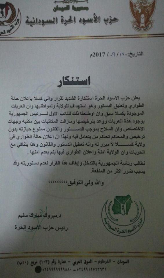 عبر حزب “الأسود الحرة” عن إستنكاره الشديد للقرار الذي أصدره آدم جماع والي كسلا الخاص بإعلان حالة الطوارئ وتعليق الدستور.. معتبراً أن ذلك يعد إستهدافاً للولاية ومواطنيها.