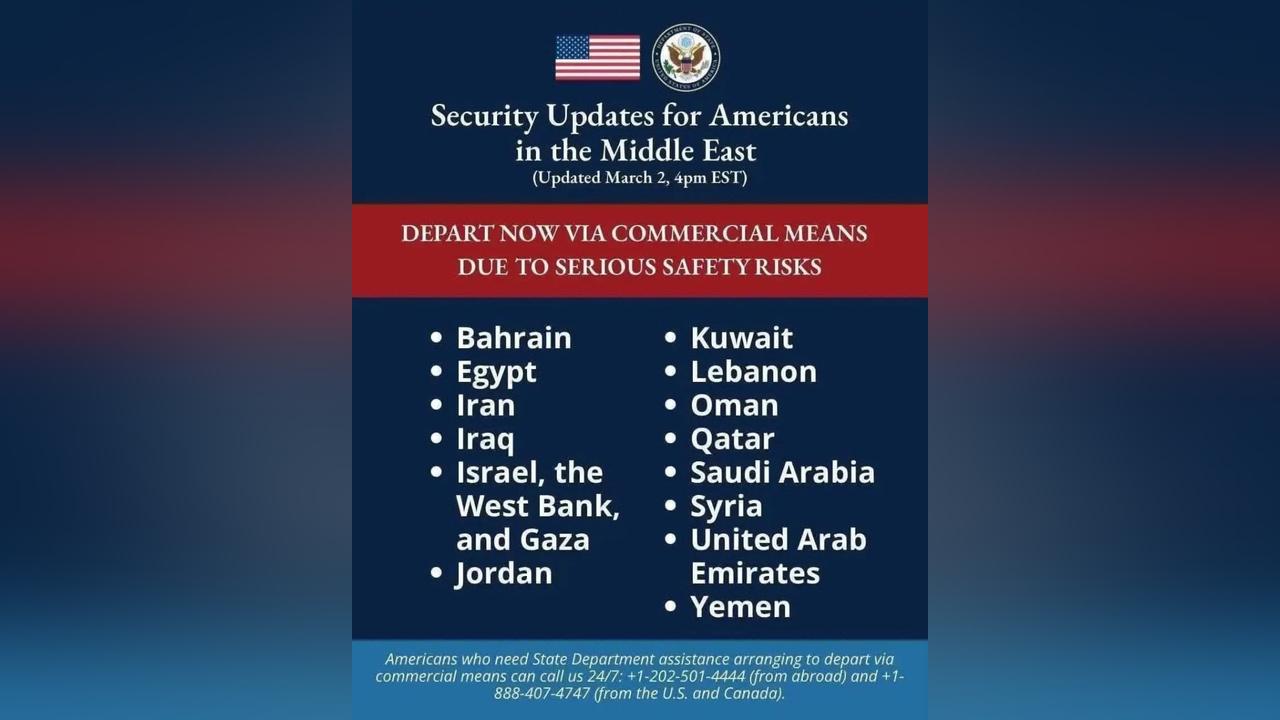 وقالت مساعدة وزير الخارجية للشؤون القنصلية مورا نامدار، إنّ الوزارة حثّت الأمريكيين على المغادرة ⁠باستخدام وسائل تجارية من البحرين ومصر وإيران والعراق وإسرائيل والضفة الغربية وقطاع غزة والأردن والكويت ⁠ولبنان وعُمان وقطر والسعودية وسوريا والإمارات واليمن.