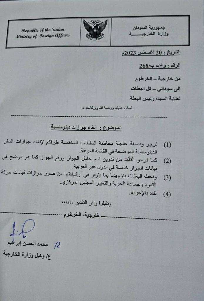 أفريقيا برس – السودان. كشف خطاب رسمي عن الغاء وزارة الخارجية السودانية؛ جوازات سفر دبلوماسية لقيادات بالحرية والتغيير أبرزهم محمد الفكي سليمان عضو مجلس السيادة السابق وخالد عمر وزير شؤون مجلس الوزراء في حكومة حمدوك. وشمل الالغاء جوازات لقيادات بالدعم السريع ابرزهم آل دقلو.