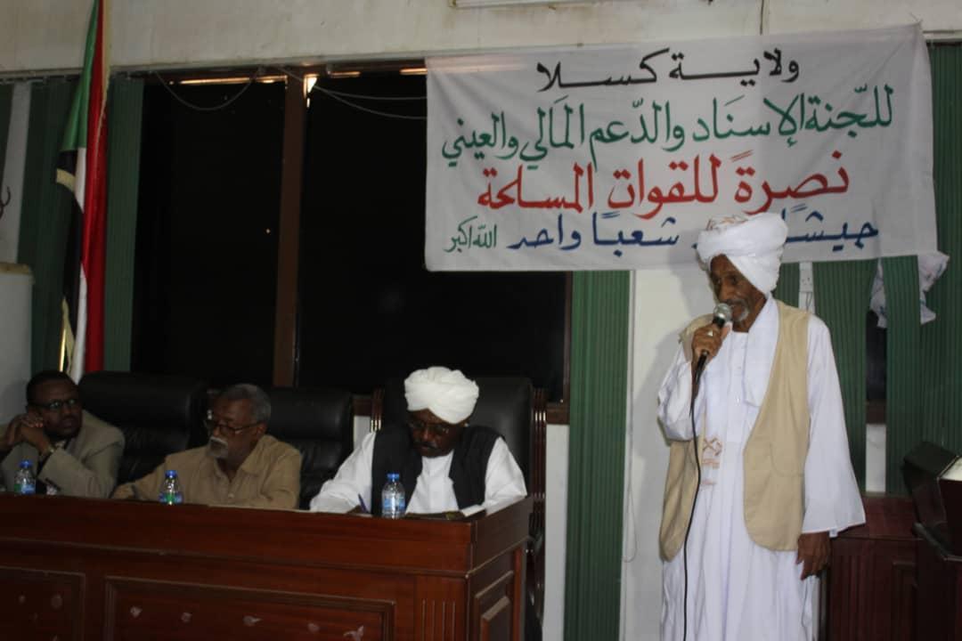 وقال لدى مخاطبته بقاعة المجلس التشريعي بكسلا الاجتماع الاول للجنة الاسناد المالي والعيني بالولاية ان كافة مكونات المجتمع الكسلاوي استجابت بصورة ممتازة لنداء التعبىئة والاستنفار بالانخراط في معسكرات التدريب في كل المحليات.