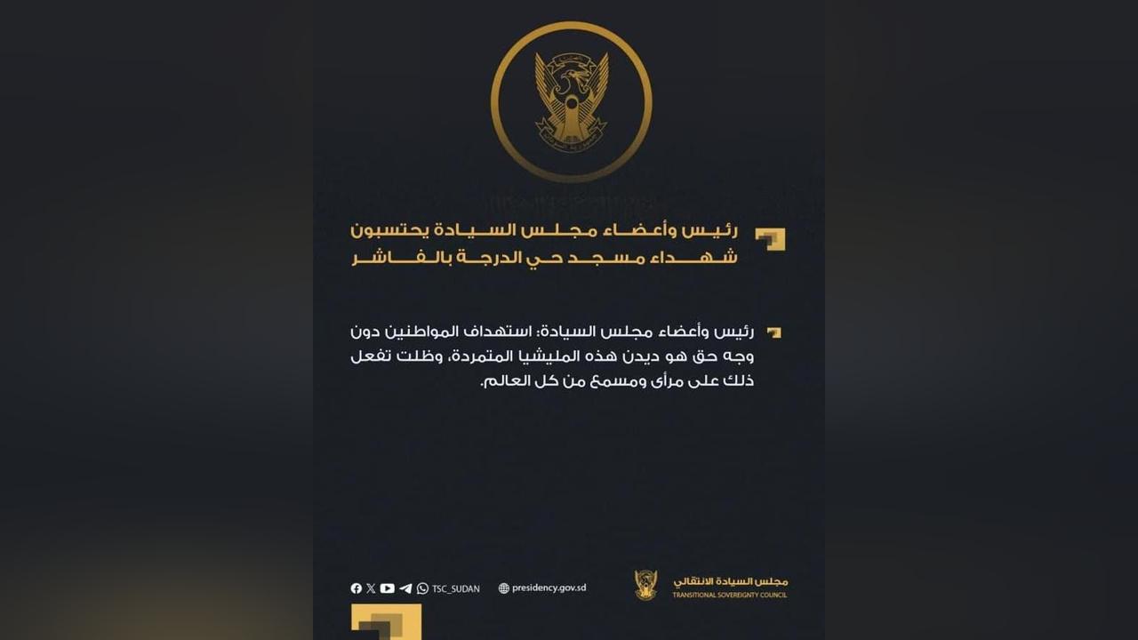 وأضاف إعلام مجلس السيادة في بيان له اليوم إن “رئيس وأعضاء مجلس السيادة إذ ينعون هؤلاء الشهداء، إنما ينعون للشعب السوداني زمرة من المواطنين العزل والأخيار الذين لبوا نداء ربهم وهم في بيت من بيوت الله”.