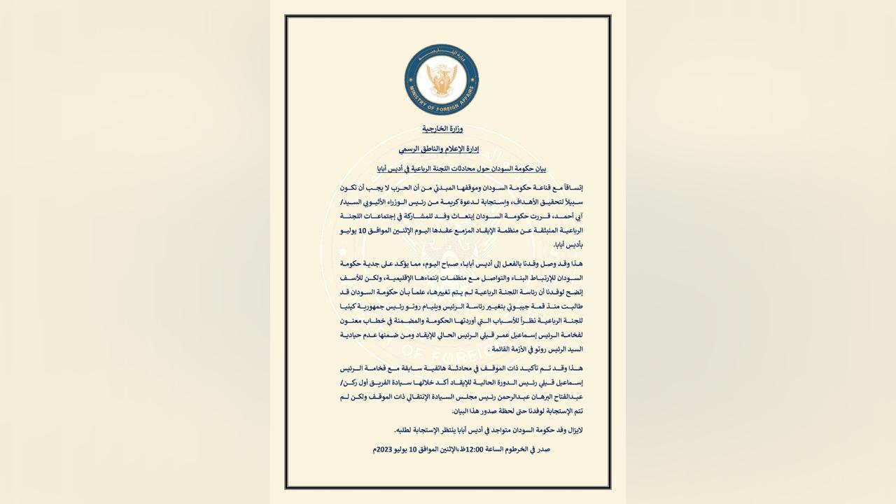 وتابع “هذا وقد تم تأكيد ذات الموقف في محادثة هاتفية سابقة مع فخامة الرئيس إسماعيل قيلي رئيس الدورة الحالية للإيقاد أكد خلالها سيادة الفريق أول ركن عبد الفتاح البرهان عبد الرحمن رئيس مجلس السيادة الإنتقالي ذات الموقف ولكن لم تتم الإستجابة لوفدنا حتى لحظة صدور هذا البيان ولايزال وفد حكومة السودان متواجد في أديس أبابا ينتظر الإستجابة لطلبه.