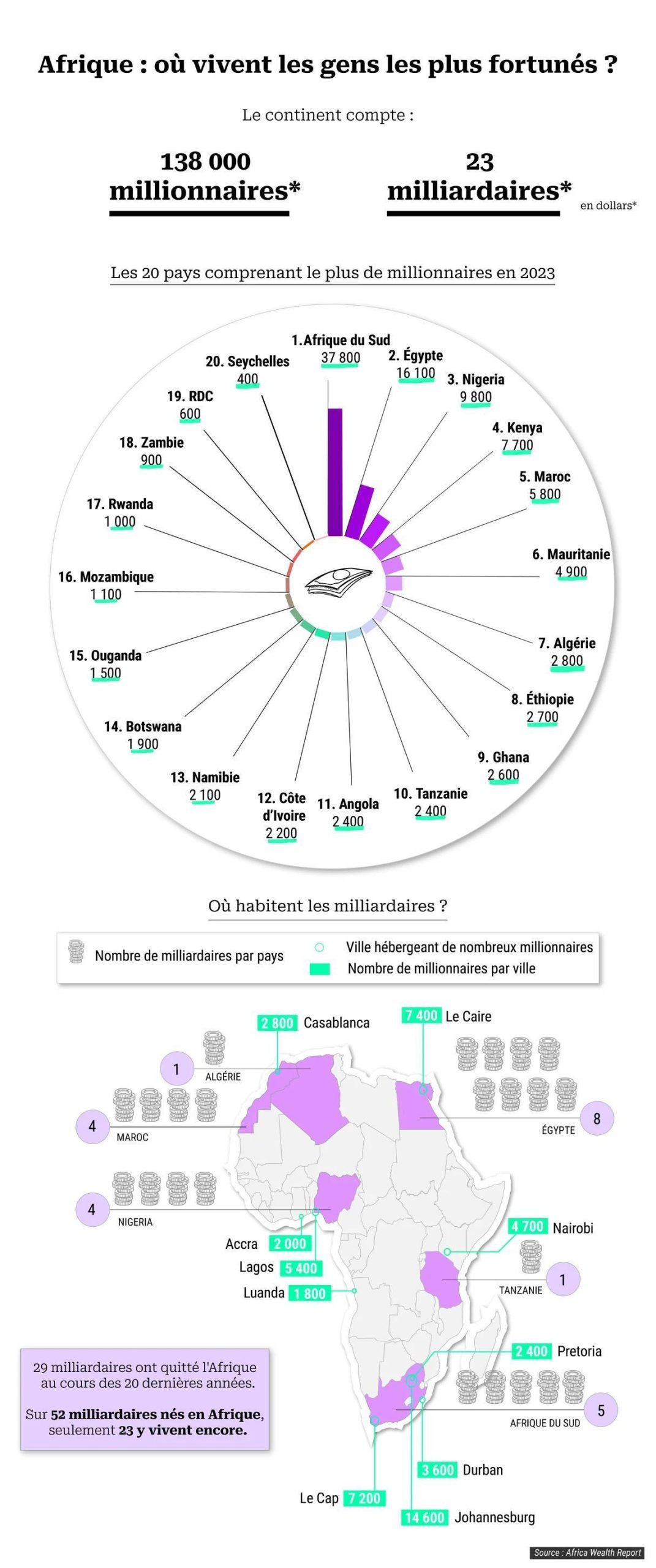 Africa-Press – Tchad. Ils sont près de 140 000 millionnaires et plus de 20 milliardaires – en dollars – à vivre sur le continent. Dans quels pays résident-ils ? Où le nombre d’ultrariches a-t-il le plus augmenté ? Décryptage en infographies.
