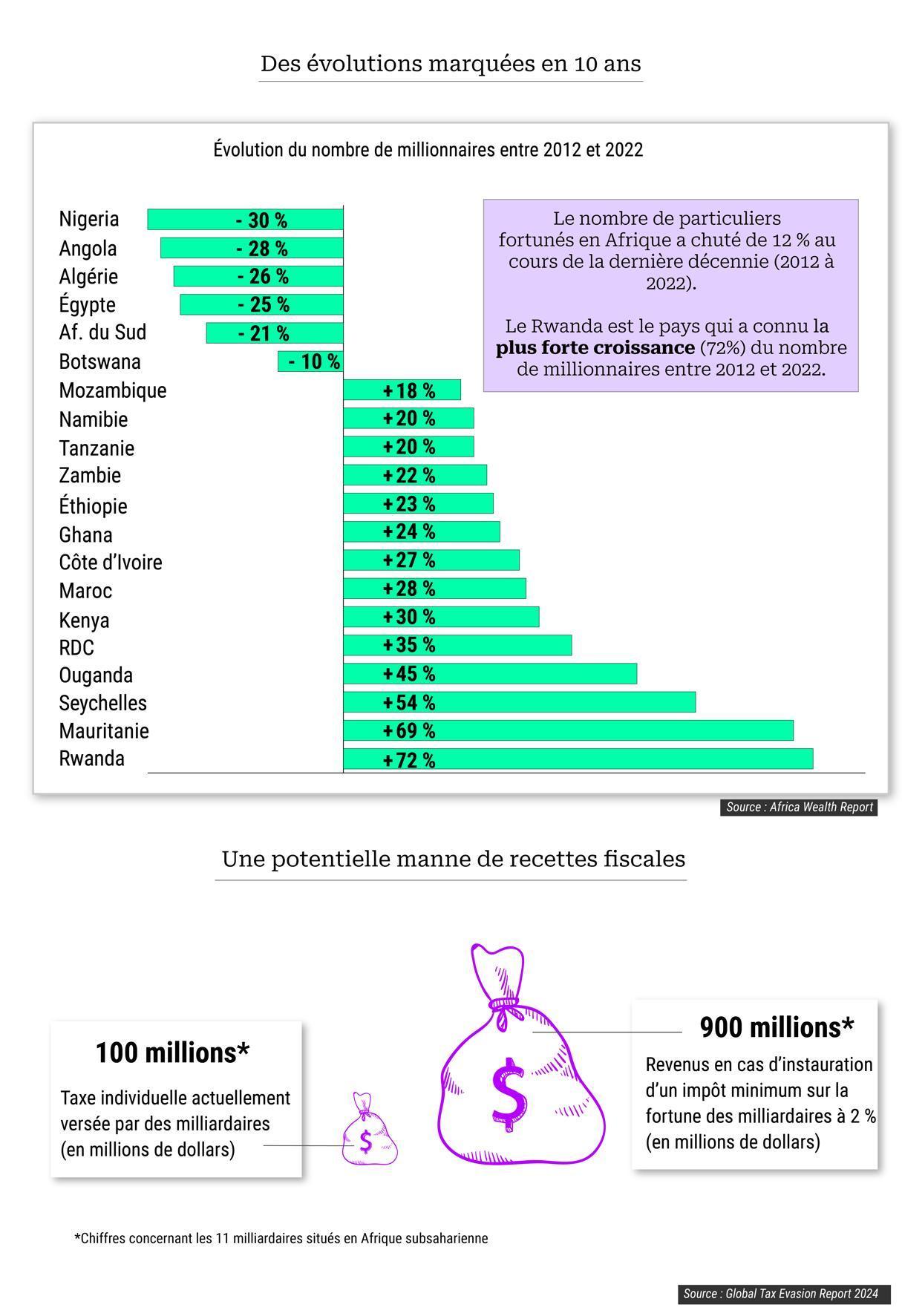 Au-delà du « palmarès », dont nous détaillons ici en infographies l’essentiel des enseignements à retenir, nous avons également repris les chiffres publiés dans le « Rapport mondial sur l’évasion fiscale 2024 », publié par l’Observatoire européen de la fiscalité. Selon les experts qui ont étudié les fortunes de 11 milliardaires vivant en Afrique subsaharienne, ceux-ci versent quelque 100 millions de dollars d’impôts et taxes aux États dans lesquels ils résident. Selon eux, en cas d’instauration d’un impôt sur la fortune d’un montant de 2 %, les ressources fiscales obtenues s’élèveraient à 900 millions de dollars.