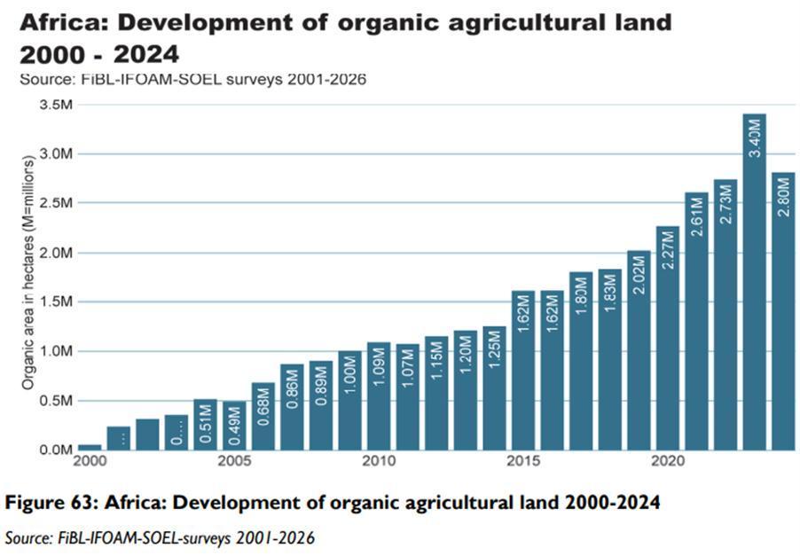 En 2024, l’Afrique a enregistré une contraction notable de ses superficies dédiées à l’agriculture biologique, qui sont passées d’environ 3,4 millions d’hectares à un peu plus de 2,8 millions d’hectares. C’est ce qui ressort de la dernière édition du rapport « The World of Organic Agriculture » publié le 14 février dernier par l’Institut de recherche de l’agriculture biologique (FiBL).