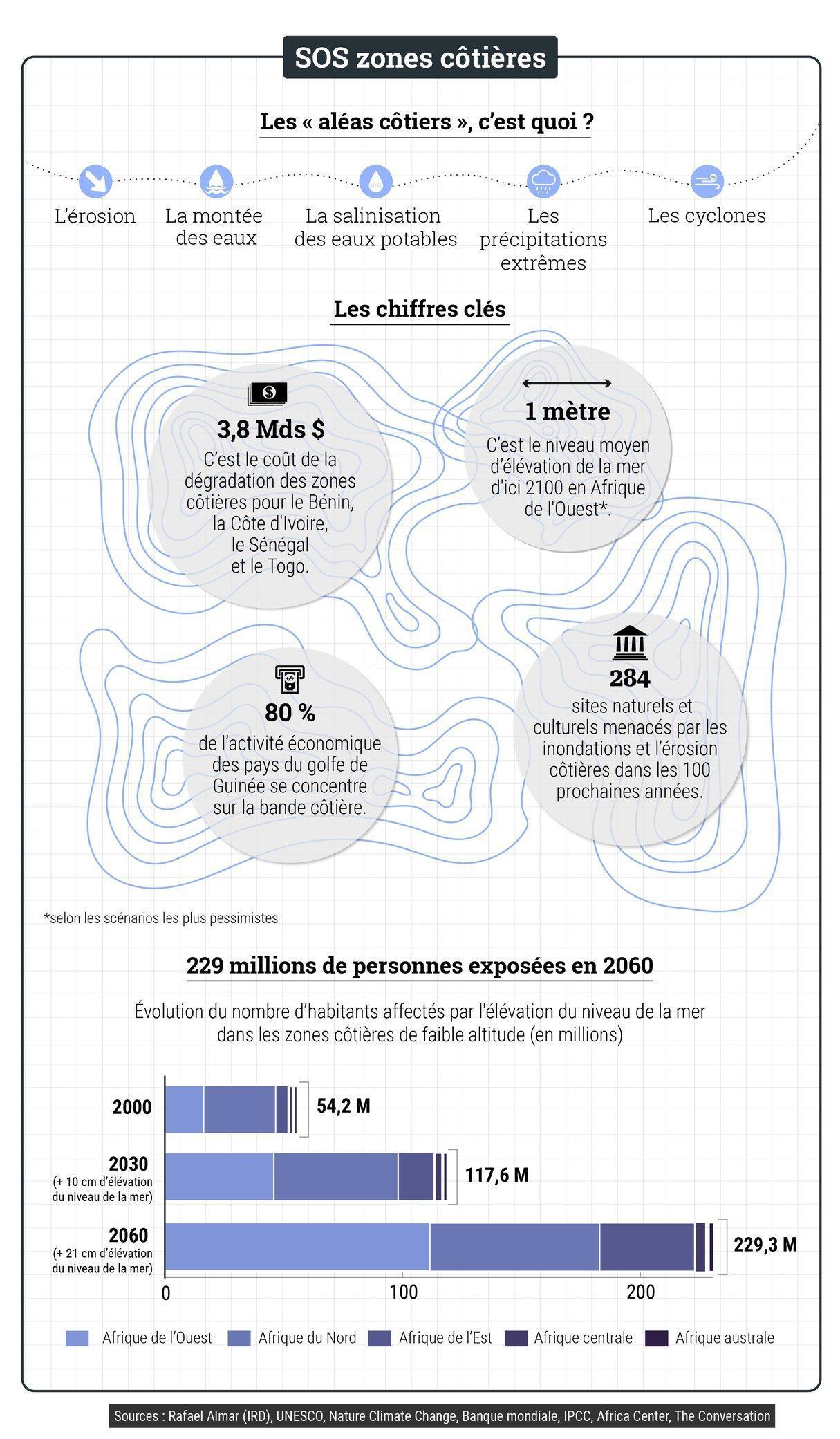 Selon les estimations du Giec, la hausse du niveau des mers devrait atteindre près d’un mètre d’ici à 2100 dans le cas d’un scénario de réchauffement climatique à +4°C. Sur le court terme, ce sont entre 108 et 116 millions d’Africains résidant sur les zones côtières qui seront exposés dès 2030. Et la dynamique s’accélère : ils seront 265 millions à y vivre d’ici à 2100. Existe-t-il des pistes pour résoudre cette équation ? Rendez-vous ce jeudi 9 novembre, dans le second volet de cette analyse en infographie pour le savoir.