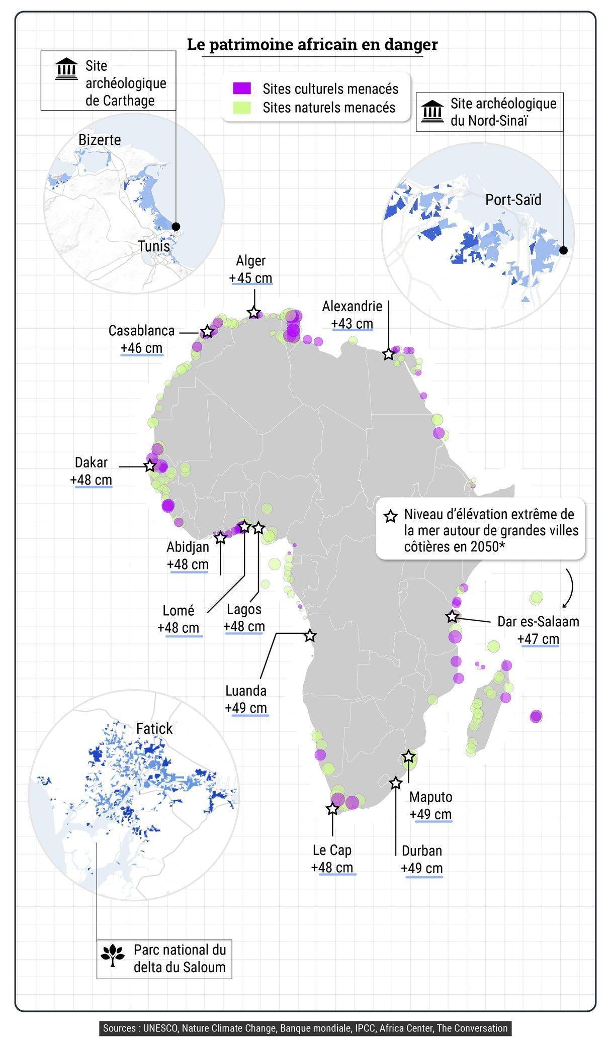 En Afrique, c’est déjà une réalité face à laquelle les populations côtières doivent s’adapter, tant bien que mal. Écoles, maisons, cimetières… Du Sénégal au Bénin en passant par le Maroc, des pans entiers de quartiers sont peu à peu grignotés par les eaux. Parfois, il s’agit de monuments historiques ou naturels, inscrits au patrimoine de l’humanité, à l’image des sites archéologiques dans le nord du Sinaï, en Égypte, ou du parc national du Sine Saloum, dans le sud du Sénégal.
