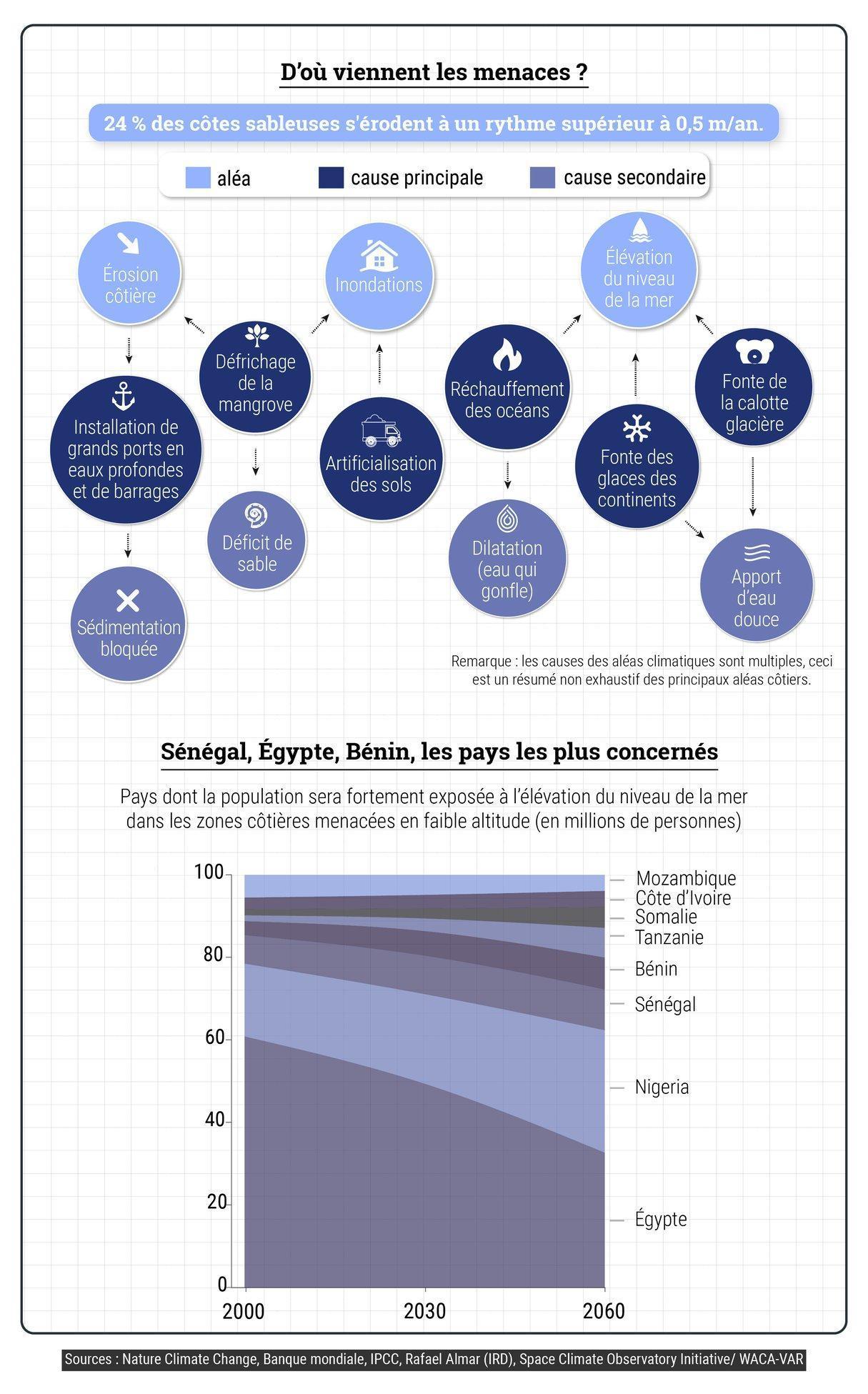 Un phénomène potentiellement dévastateur en Afrique de l’Ouest, ou un tiers de la population vit en zone côtière. « Pour l’instant, l’érosion en Afrique de l’Ouest est principalement due au déficit de sable provoqué par la mise en place de barrages hydroélectriques, qui provoquent un déficit de sédimentation », explique Rafael Almar, océanographe physicien à l’Institut de recherche pour le développement (IRD). « L’apport de sable a ainsi largement diminué dans les rivières. Quant aux inondations qui frappent les zones côtières, elles peuvent être dues au défrichement de la mangrove dans les estuaires, mais aussi engendrées par l’urbanisation galopante. »