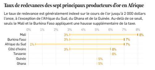 Le Ghana, avec une redevance fixe de 5 %, cherche aussi à tirer son épingle du jeu. Le premier producteur africain de métal jaune prévoit de présenter au Parlement un projet de loi visant à augmenter la redevance. Mais, malgré la mise à jour des codes miniers, « la fiscalité reste en général associée au code minier qui était en vigueur au moment de l’obtention du permis d’exploitation », fait savoir Bertrand Laporte.