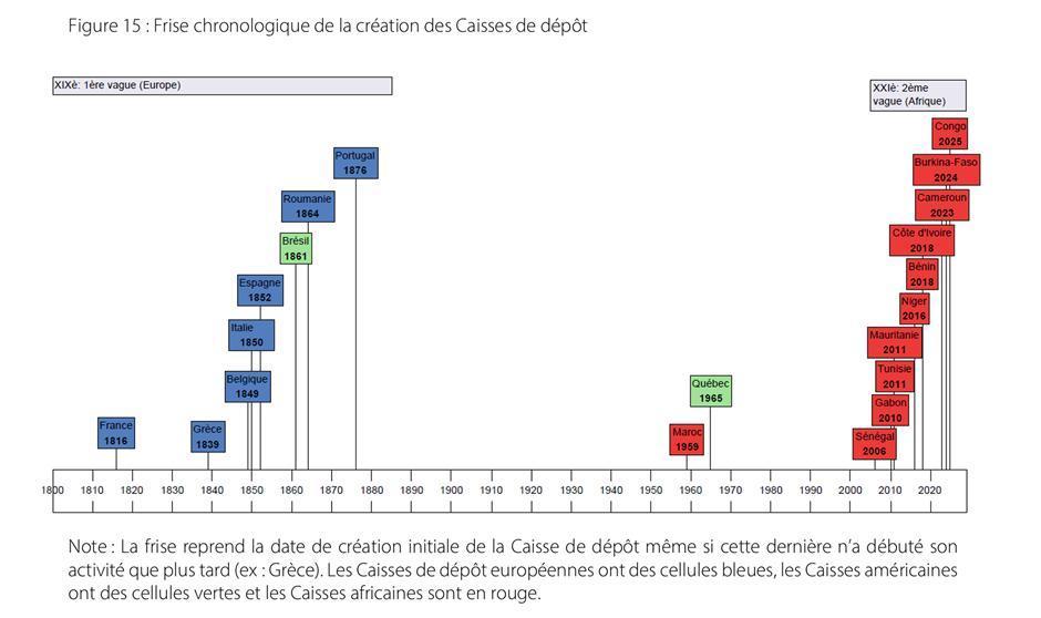 Sur le continent, peu de caisses de dépôt ont été créées entre les années 1860 et 2010, mais une nouvelle dynamique s’est enclenchée depuis une vingtaine d’années, surtout en Afrique francophone. Une seconde vague a débuté avec le Sénégal en 2006, suivie par le Gabon (2010), la Mauritanie et la Tunisie (2011), puis le Niger (2016), le Bénin et la Côte d’Ivoire (2018), le Cameroun (2023), le Burkina Faso (2024) et plus récemment le Congo. De nouveaux projets sont annoncés au Mali et en République démocratique du Congo pour 2025, tandis que d’autres pays — comme le Togo, le Burundi, le Tchad, la Guinée ou la Guinée équatoriale — ont exprimé leur intérêt.